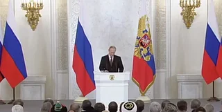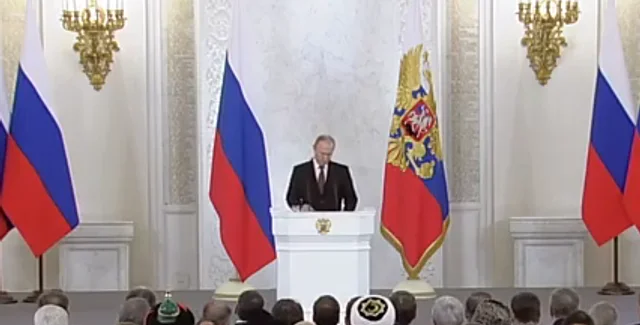В тот же день в Кремле Путин, нелегитимный премьер-министр Крыма Сергей Аксенов, председатель распущенного Верховной Радой Украины парламента Крыма Владимир Константинов и "уполномоченный представитель города Севастополь" Алексей Чалый подписали договор между РФ и Республикой Крым о принятии в Россию Крыма и образовании в составе РФ новых субъектов.