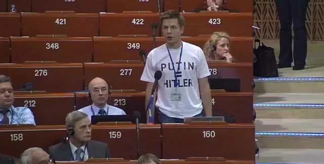 По его словам, когда он выступил на дебатах относительно событий в Крыму в футболке с надписью PUTIN = HITLER, сравнивая действия Путина с аншлюсом Австрии Гитлером, это возмутило россиян.