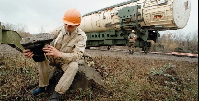 Былая мощь. Осмотр двигателя ракеты ss-19 Stilet (по натовской квалификации) на Южном машиностроительном заводе в Днепропетровске (1996)
