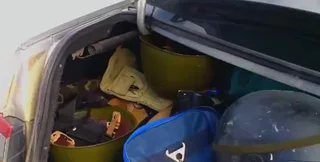 В багажнике автомобиля правоохранителями были обнаружены и изъяты противогазы, две резиновые дубинки, два бронежилета, саперная лопатка, два ножа, пистолетная кобура, 2 травматических пистолета, две армейские каски и одна милицейская.
