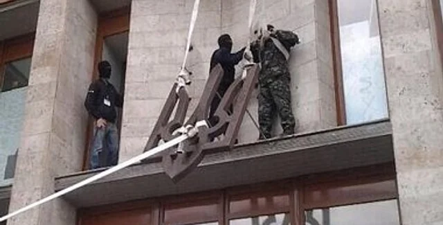 15 апреля неизвестные в балаклавах сняли и сбросили герб Украины со здания Донецкой областной государственной администрации