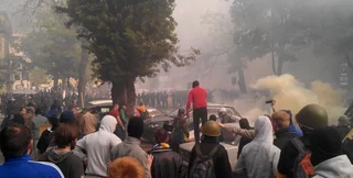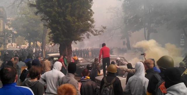 После исполнения гимна Украины колонна только начала движение, как со стороны Александровского проспекта появились молодчики в масках и с битами. Полетели шумовые гранаты, начались столкновения, в которых участвуют несколько тысяч человек. Люди разбирают тротуарную плитку, разбивают на части и швыряют друг в друга. Гремят взрывы, слышны звуки, похожие на выстрелы. Несколько кордонов милиции разделили оппонентов, но камни и гранаты продолжают лететь через их головы, все в дыму.