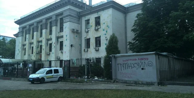 Однако впоследствии митингующие начали забрасывать посольство яйцами с зеленкой и портить автомобили посольства, а количество митингующих выросло до 500 человек. "На место события прибыли активисты "Самообороны Майдана" для помощи в прекращении правонарушений", - отметили в милиции.