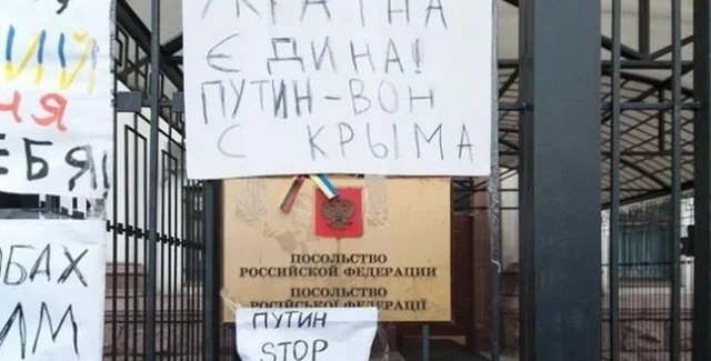 Напомним, 14 июня возле посольства РФ в Украине состоялась акция протеста против агрессивной политики Кремля и поддержки действий террористов и сепаратистов, которые приводят к гибели украинских граждан и военнослужащих. Активисты забросали посольство яйцами, зеленкой, перевернули машины. Гнев активистов вызвала трагедия со сбитым ночью в Луганске самолета ИЛ-76 и гибели 49 украинских военных, находящихся в нем. У протестующих нет сомнений, что за действиями террористов, сбивших самолет с ПЗРК стоит руководство РФ во главе с Владимиром Путиным.