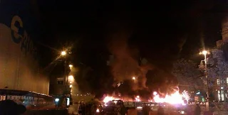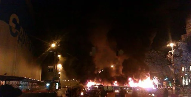На Крещатике, возле Цума, загорелась баррикада Майдана.