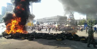 Обитатели палаточного городка бросают в сторону бойцов брусчатку, коктейли Молотова. Горят баррикады напротив Дома профсоюзов и покрышки со стороны Европейской площади. Работают пожарные расчеты.