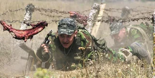 Чтобы познакомить украинских журналистов с модулями новой программы, прессу собрали на полигоне под Одессой и показали полосу препятствий, где тренируются курсанты Одесской военной академии. Она похожа на те, что можно увидеть в голливудских фильмах о морских котиках. Большие колонки изрыгают звуки выстрелов, взрывов и крики раненых, имитируя обстановку реального боя. На колючей проволоке развешены куски внутренностей животных, которые должны еще больше вывести бойцов из состояния психологического равновесия. Горло раздирает от дыма — кроме огня, горящего повсеместно, отчаянно чадят дымовые шашки. Мало кто из нас, вызвавшихся преодолеть полосу препятствия, сумел пройти все испытания.