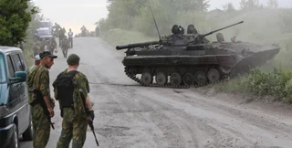 По информации из Twitter, колонна российских танков разбита на подходе к городу в селе Широкино. Горят два танка из восьми. Идет жесткий бой.