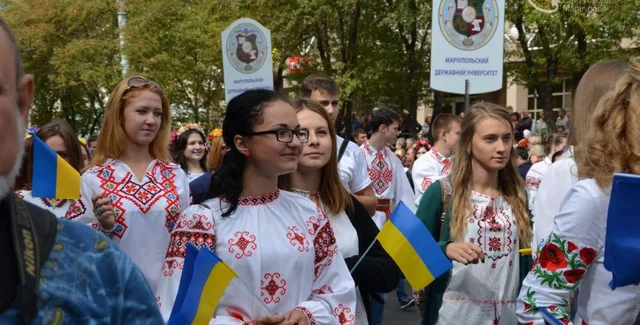 В 12:00 сотни одетых в национальные костюмы мариупольцев прошли Парадом вышиванок по пр. Ленина.
