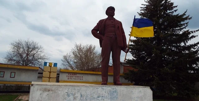 Патриотично настроенные активисты поселка обвязали голову памятника желто-синей повязкой, "вручили" ему украинский флаг.