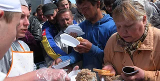 Свои акции к 9 мая провели и ряд пророссийских организаций. Самую многочисленную организовал Оппозиционный блок - возле арки Дружбы народов. Но число ее участников было в несколько раз меньше от заявленных 20 тысяч. Основной контингент – молодежь и пенсионеры, которых формировали в колонны и организовано вели в Мариинский парк. На вопросы Фокуса о своих дальнейших планах участники акции не могли дать вразумительного ответа. Позже все колонны свели вниз к площади перед аркой, где их развлекали выступлениями девушек-барабанщиц в мини-юбках, детско-юношеского оркестра и короткими выступлениями представителей Оппозиционного блока. Но наибольший интерес вызвала раздача бесплатной каши, которую готовили на установленных здесь же полевых кухнях. В толкотне едва не перевернули несколько столиков. Получив свою порцию, многие участники акции разбредались с тарелками по окрестностям. Акция продлилась два с лишним часа.