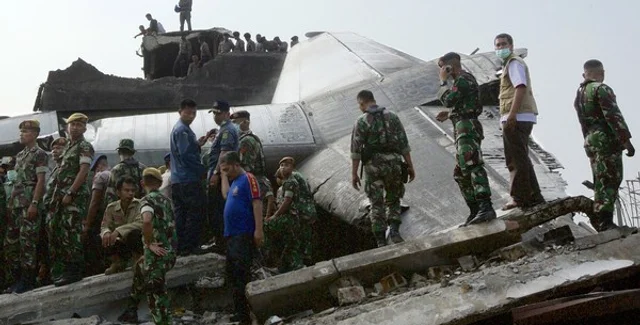Индонезийский военно-транспортный самолет разбился в городе Медан в провинции Северная Суматра во вторник, упав на жилые дома и гостиницу. По данным СМИ, на борту находились 122 человека, все они погибли.