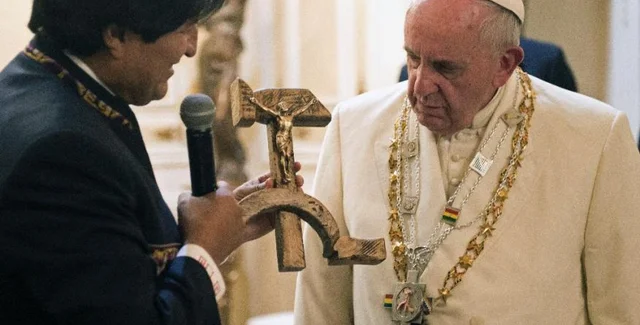 Подарок вызвал недоумение среди консервативных католиков, заявивших, что папой манипулируют в идеологических целях. Реакция самого понтифика была неясной. Получив распятие на церемонии, он несколько секунд его изучал, после чего вернул его помощнику президента Боливии.