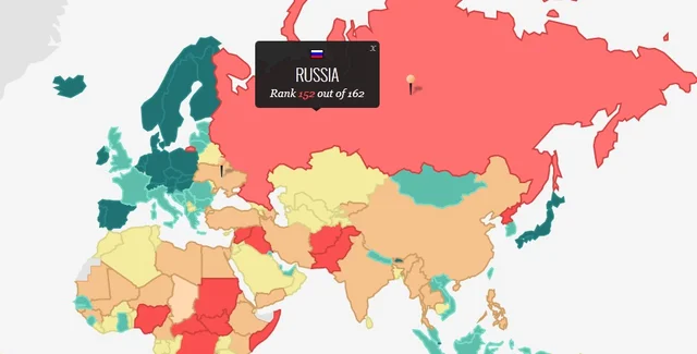 Россия оказалась между КНДР и Нигерией, заняв 152-е место из 162-х возможных. Самой опасной страной признана Сирия, за ней идут Ирак и Афганистан. Также в десятку вошли Южный Судан, Судан, Центральноафриканская Республика, Сомали, Конго, Пакистан и Северная Корея.