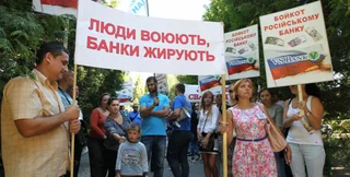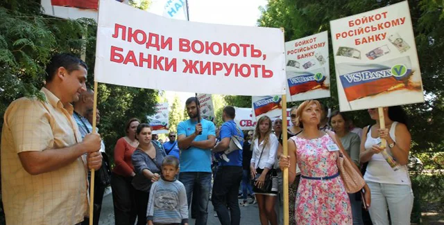 20 августа активисты организовали во Львове бессрочную акцию против российских банков. Пикетчики требуют от банков в течение двух недель прекратить деятельность и покинуть территорию Львовской области