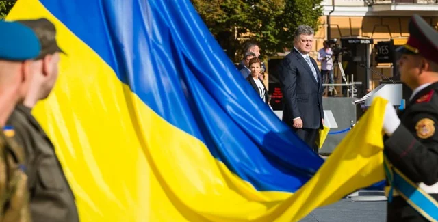 "Наш флаг родом из исконных народных мечтаний о свободе. В этих мыслях золотой цвет символизировал урожайное поле и спелую пшеницу, а синий цвет – это знак безоблачно чистого спокойного неба над Украиной. Объединение синего и желтого - это мечта украинцев о мирной, хлебной и богатой жизни", - сказал Порошенко.