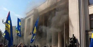 Между митингующими под стенами Верховной Рады и сотрудниками Нацгвардии, стоящими в оцеплении вокруг парламента, начались стычки.