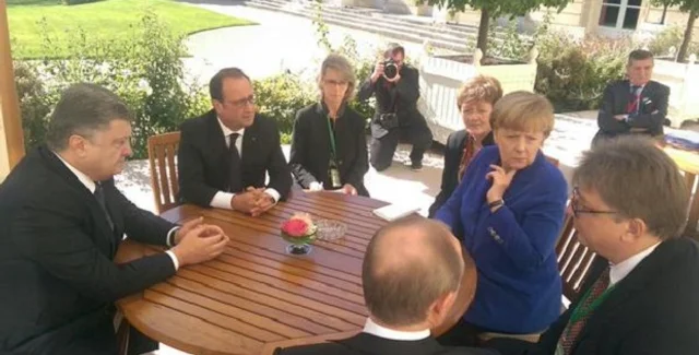 Президенты Украины, Германии, Франции и России – Петр Порошенко, Ангела Меркель, Франсуа Олланд и Владимир Путин – проводят переговоры в "нормандском формате" прямо на улице перед Елисейским дворцом в Париже.