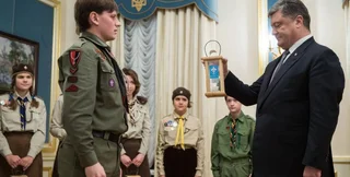 Член национального наблюдательного совета организации "Пласт" Андрей Лузан, передавая огонь в лампадку Петра Порошенко, сказал: "Нам очень нужен мир, и именно поэтому мы принесли этот символ мира вам, господин Президент".