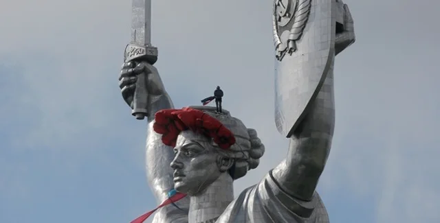 Монумент-скульптура "Родина-Мать" установлен в Киеве на высоком правом берегу Днепра. В одной руке статуя держит 16-метровый меч весом в 9 т, в другой - щит размером 13×8 м с гербом СССР (весом в 13 т).