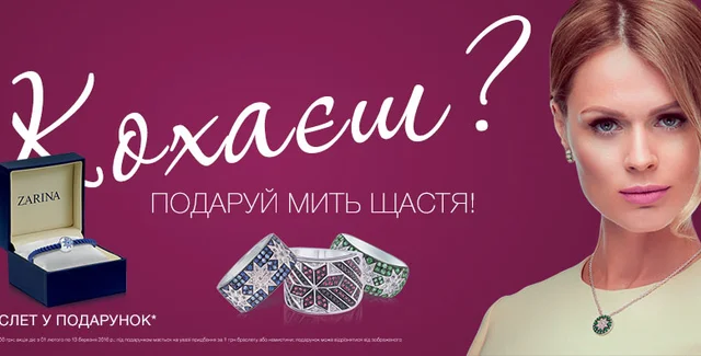 Ювелирный Дом ZARINA начинает романтическую акцию ко Дню влюбленных! К каждой покупке от 5000 грн. мы дарим стильный серебряный браслет-оберег. И это еще не все: на все украшения действует праздничная скидка 14%! Даже на новые коллекции! Сделайте свои праздники неповторимыми вместе с ZARINA