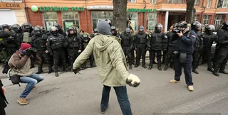 Как сообщили в эфире Hromadske ТВ, витрины филиала Сбербанка России на ул. Мазепы возле ст.м. "Арсенальна" забросали брусчаткой, кирпичом и обливали зеленкой.