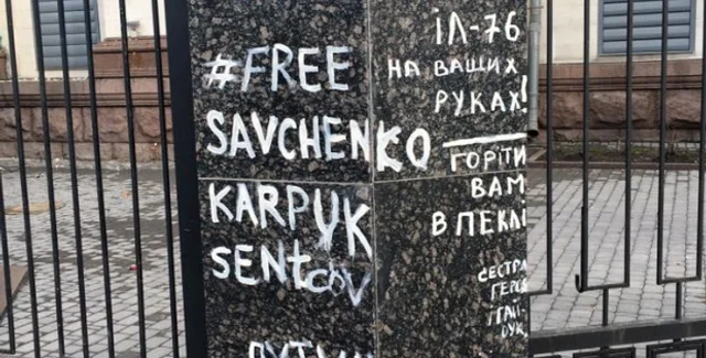 Участники проходящей в Киеве акции в поддержку народного депутата, делегата Украины в ПАСЕ, украинской летчицы Надежды Савченко, незаконно заключенной в России, забросали здание посольства России в Украине яйцами, а впоследствии - и зеленкой.