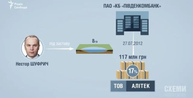 С помощью земельного участка под Киевом, который принадлежит семье Нестора Шуфрича, донецкая фирма "Алитек" получила дополнительных 47 млн грн кредита в банке "Пивденкомбанк", которые обратно так и не вернула. Об этом говорится в сюжете программы "Схемы", совместного проекта "Радио Свобода" и телеканала "UA: Первый".