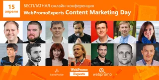 15 апреля бесплатная онлайн - конференция "WebPromoExperts Content-marketing Day" не только даст ответы, но и поможет каждому слушателю в построении уже собственной контент-стратегии для бизнеса. На конференции вас ждут кейсы "Мобиллак", "SeoPult.TV", "Запаска Отмазка", "Исповедь задрота", "Сделано Руками", "Радожива", "WebPromoExperts", "Devaka.ru", "Алло", "Фокстрот", а представитель Google расскажет, какой контент особенно нравится поисковикам.
