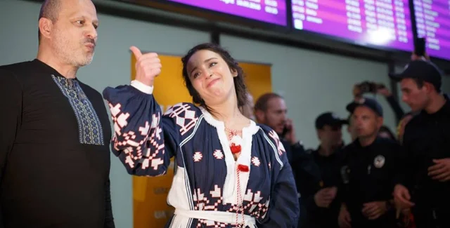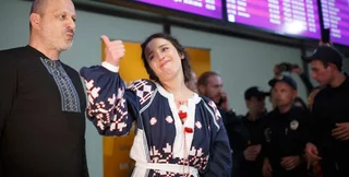 На родину Джамала вернулась под возгласы: "Спасибо", "Крым - это Украина" и пение гимна Украины.