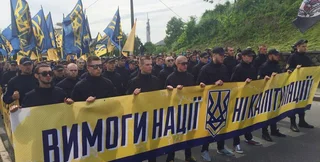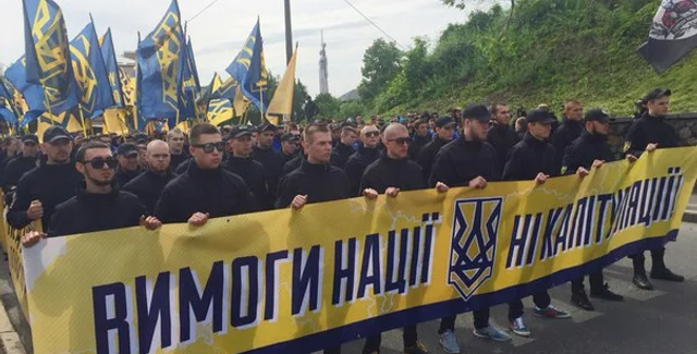 Марш "Азова" проходил под лозунгом "Требования нации - нет капитуляции". В частности, представители "Азова" выступают против проведения выборов в Донбассе "по российскому сценарию".