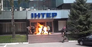 В Киеве неизвестные в масках с помощью шин и зажигательной смеси подожгли вход в офис телеканала "Интер", который расположен на улице Дмитриевской.