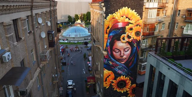В Киеве на фасаде дома по переулку Шевченко недалеко от Майдана Незалежности появился новый мурал под названием "Берегиня", созданный художником MataRuda из Коста-Рики. Об этом на своей странице в Facebook coобщил куратор проекта стенных росписей в Киеве Geo Leros.