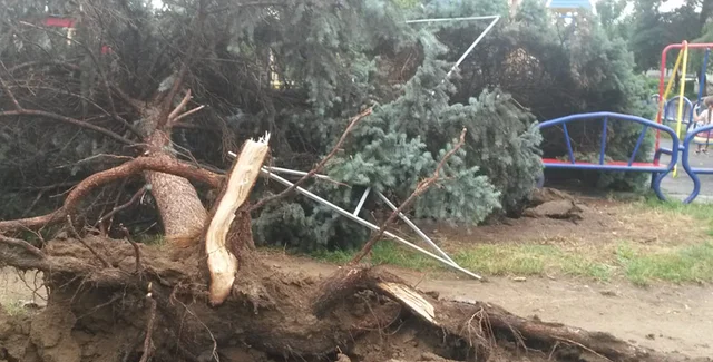 Огромная туя упала поперек пешеходной дорожки, а две ели - в направлении популярного в городе детской площадки "Рошен". Одно из деревьев упало стволом прямо на его ограду, изувечив ее. Там же ветром разбило большой зонт расположенного рядом кафе.