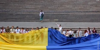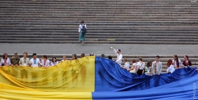 Несколько сотен одесситов пронесли огромное полотнище цветов государственного флага Украины по Потемкинской лестнице к памятнику Дюку. Одесская мэрия санкционировала прекращение ремонтных работ на лестнице для проведения этой ежегодной патриотической акции.