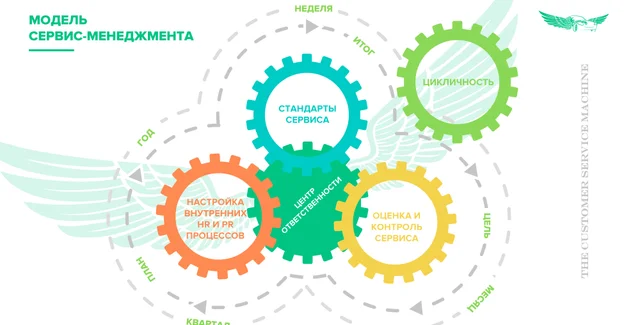 Но лучшие компании продолжают толкать маховик сервиса. Их действия системны и цикличны. В таких компаниях уже через 1,5-2 года мощная машина сервиса работает на всех: менеджеров, сотрудников, клиентов.