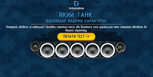 По результатам ответов на несколько вопросов посетитель узнает, какой украинский танк (мощный, быстрый или сверхпрочный) соответствует его характеру, и с какой боевой машиной ему будут не страшны коварные враги и мины на пути к победе.