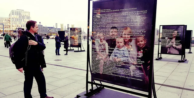 На площади перед центральным железнодорожным вокзалом в Берлине открылась выставка под открытым небом Displaced. 12 Stories from Ukraine.