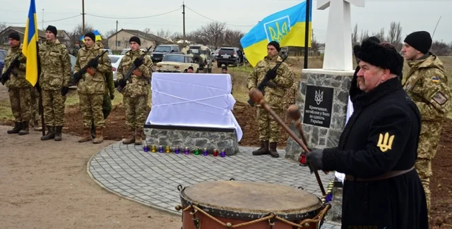 Монумент в виде казацкого креста открыли на трассе Каланчак-Армянск в шести километрах от административной границы с аннексирована Крымом. На плитах мемориала высечены фамилии 21 бойца Вооруженных сил Украины, подразделений МВД и добровольческих батальонов. Они погибли во время боевых действий в Донбассе в 2014-2016 годах.