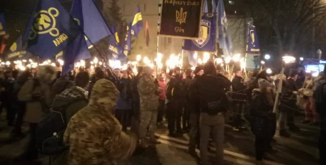 Участники шествия зажгли факелы и под лозунгами "Слава Україні! - Героям слава!" прошли по улице Ивана Мазепы.