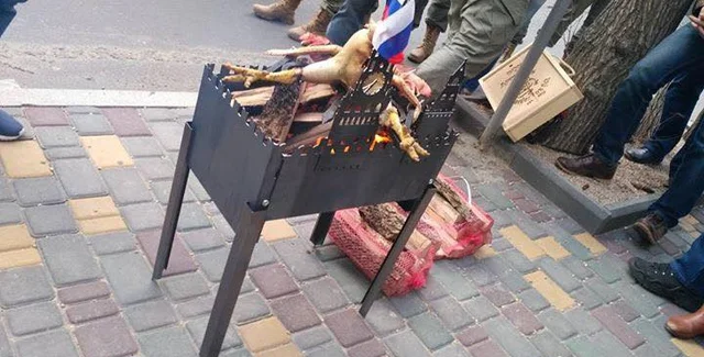 "Сегодня три года, как страна-агрессор провела псевдореферендум и аннексировала Крым. Мы провели акцию-флешмоб и зажарили на мангале в виде Кремля символ рашистской империи - двуглавого петуха, нанизанного на флаг России", - сказала одна из организаторов акции, руководитель Центра помощи участникам АТО Наталья Кручинина.