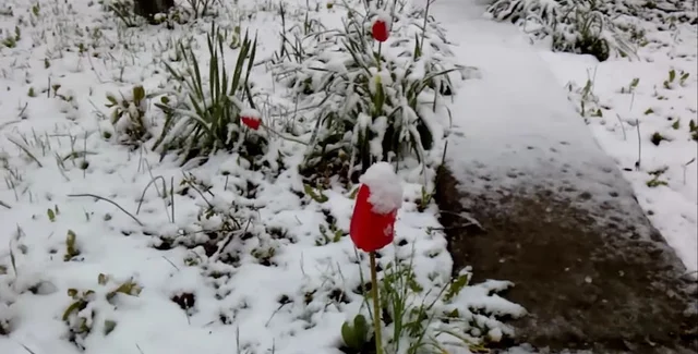 На видео видно, как тюльпаны, которые недавно распустились, засыпаны снегом.