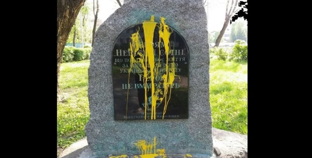 Неизвестные облили желтой краской гранитную памятную доску с надписью "Герои не умирают". Памятник находится в столичном парке на улице Набережно-Корчеватской (на территории жилого массива "Корчеватое").