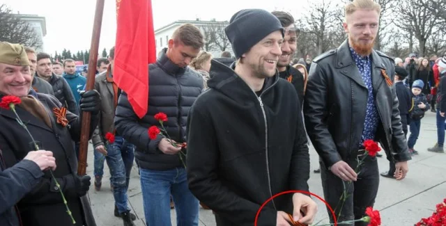 Бывший капитан национальной сборной Украины Анатолий Тимощук, который тренирует "Зенит" в Санкт-Петербурге, 9 мая появился на параде с георгиевской ленточкой.