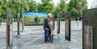 На стелах – фотографии погибших и фраза "Герои не умирают" на четырех языках: украинском, английском, немецком и французском. На них размещены фотографии с передовой, снятые украинскими военными фотокорреспондентами.