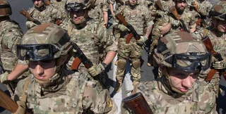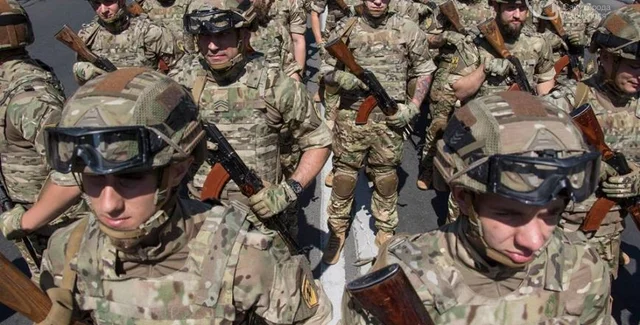 После парада военной техники, военные прошлись торжественным маршем по центральной площади Мариуполя.