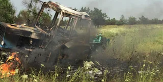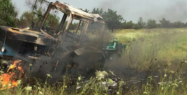 "Трактор наехал колесом на мину в поле за 1,5 км от жилых домов на выезде из поселка Гнутово. Техника выгорела дотла. Тракторист-водитель получил осколочные и ожоговые ранения, еще у одного пассажира 1994 года рождения предварительно констатировано контузию и шок. Оба доставлены с места происшествия в больницу", - говорится в сообщении.