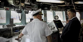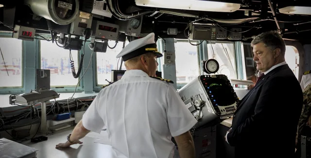 Президент Украины Петр Порошенко во время рабочей поездки в Одесскую область посетил флагман Военно-морских сил Вооруженных сил Украины фрегат "Гетман Сагайдачный", который участвует в международных военно-морских учениях "Си Бриз-2017".