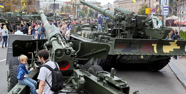 Всего в центре Киева от улицы Институтской до Европейской площади разместят 70 единиц военной техники и вооружения. В частности, уже можно увидеть танки, БТРы, пушки, реактивные системы, боевые, санитарные и медицинские машины, грузовики, мотоциклы, снегоходы, легковые автомобили Вооруженных Сил Украины, Госпогранслужбы и Нацгвардии.