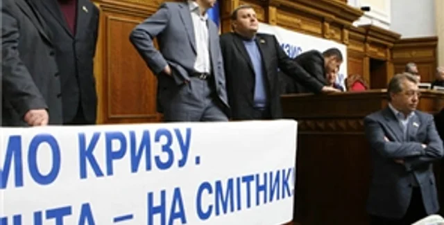 Представители Партии регионов развесили по сессионному залу плакаты с надписями: "Кризис - стоп! Власть - в отставку!", "Долой коалицию национального дерибана!", "Литвин, твоя коалиция грабит людей!", "Бездарную власть - на переплавку!"